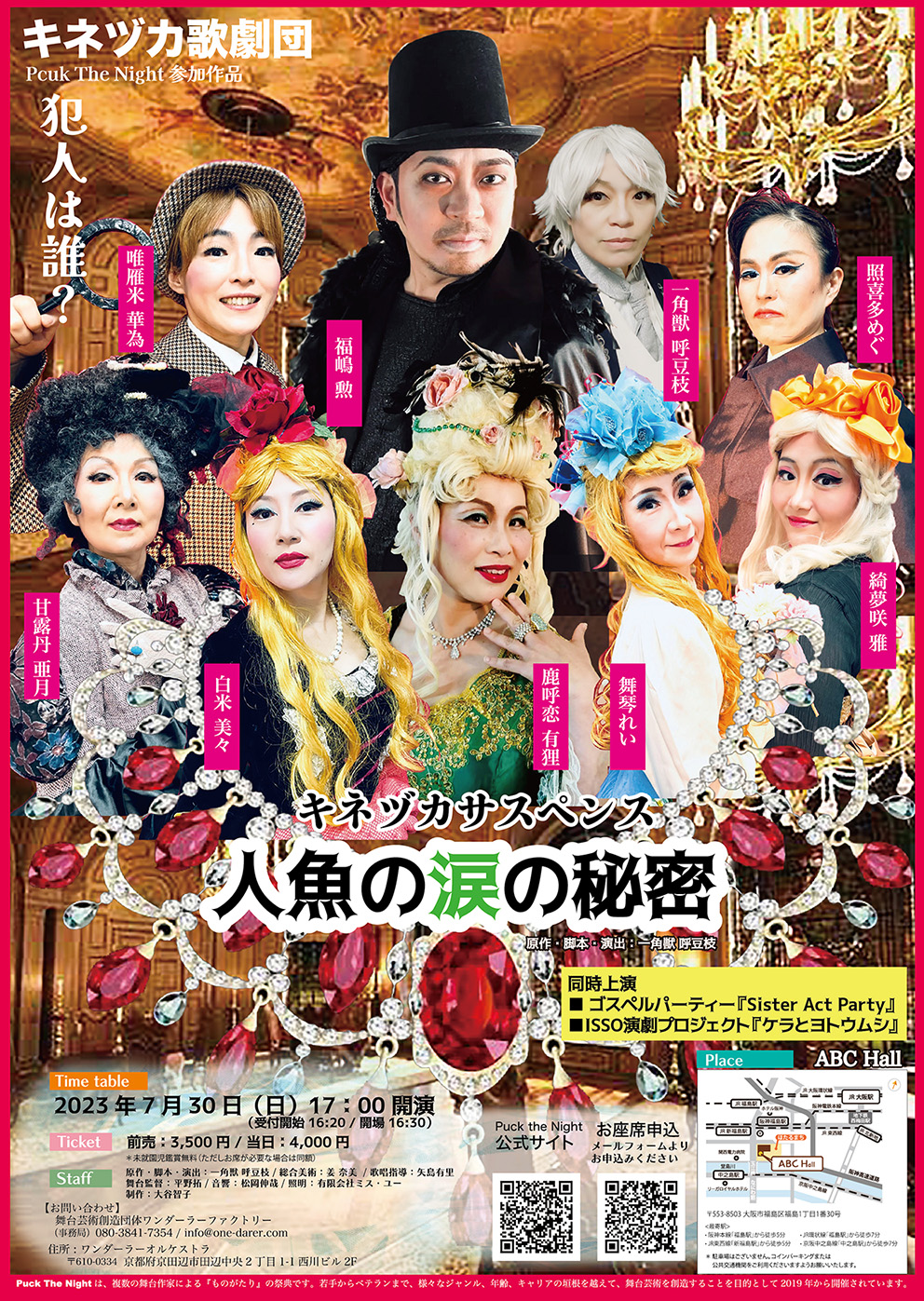 | キネヅカ歌劇団〝初〟のサスペンス作品。 オペラコンサートの控室でおきた盗難事件。 盗まれた秘宝は『人魚の涙』と呼ばれる首飾り。 犯人はこの中にいるのか!? 〝腕に覚えのある〟出演者たちによる 痛快コメディー! …もとい、 グランドロマン作品!乞うご期待! |