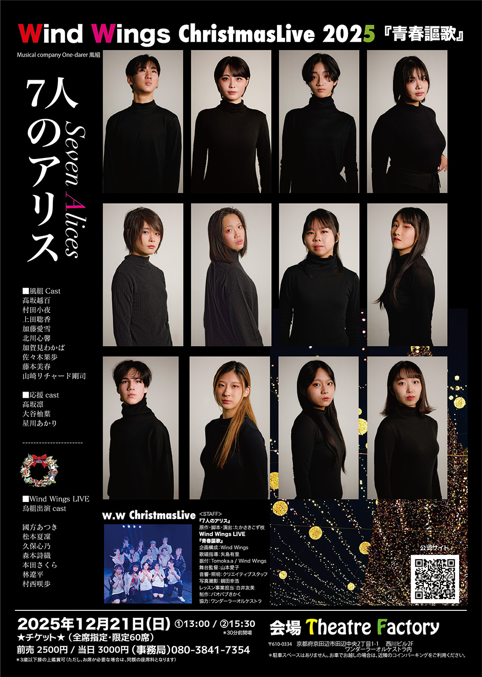 ![]() 今年のクリスマスライブは 創作音楽劇 『7人のアリス』 Wind Wings LIVE 『青春謳歌』 二本立て!! |